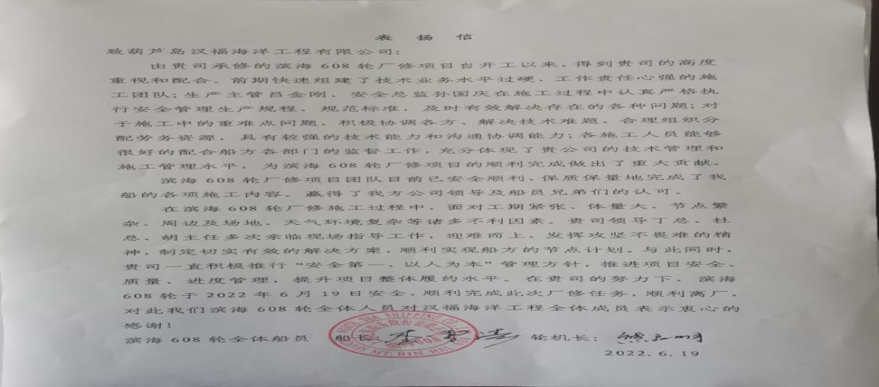 “真诚服务为船东保质保量保安全”获赠锦旗